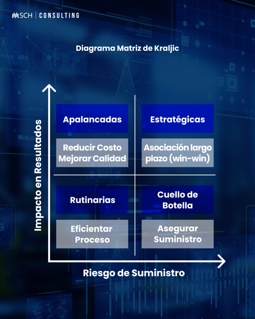 La Matriz de Kraljic es una herramienta ampliamente utilizada en la Gestión de Categorías, que permite segmentar los bienes y servicios y definir estrategias de abordaje según el Riesgo de Suministro e Impacto para el Negocio. Esta matriz clasifica las categorías en cuatro cuadrantes, cada uno con una estrategia general asociada. Los cuadrantes de la matriz son: Apalancados, No Críticos, Cuellos de Botella y Estratégicos.